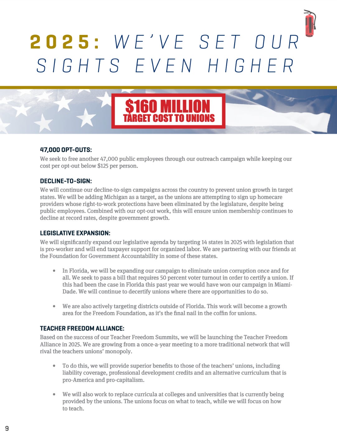 "We will significantly expand our legislative agenda by targeting 14 states in 2025 with legislation that is pro-worker and will end taxpayer support for organized labor. We are partnering with our friends at the Foundation for Government Accountability in some of these states."