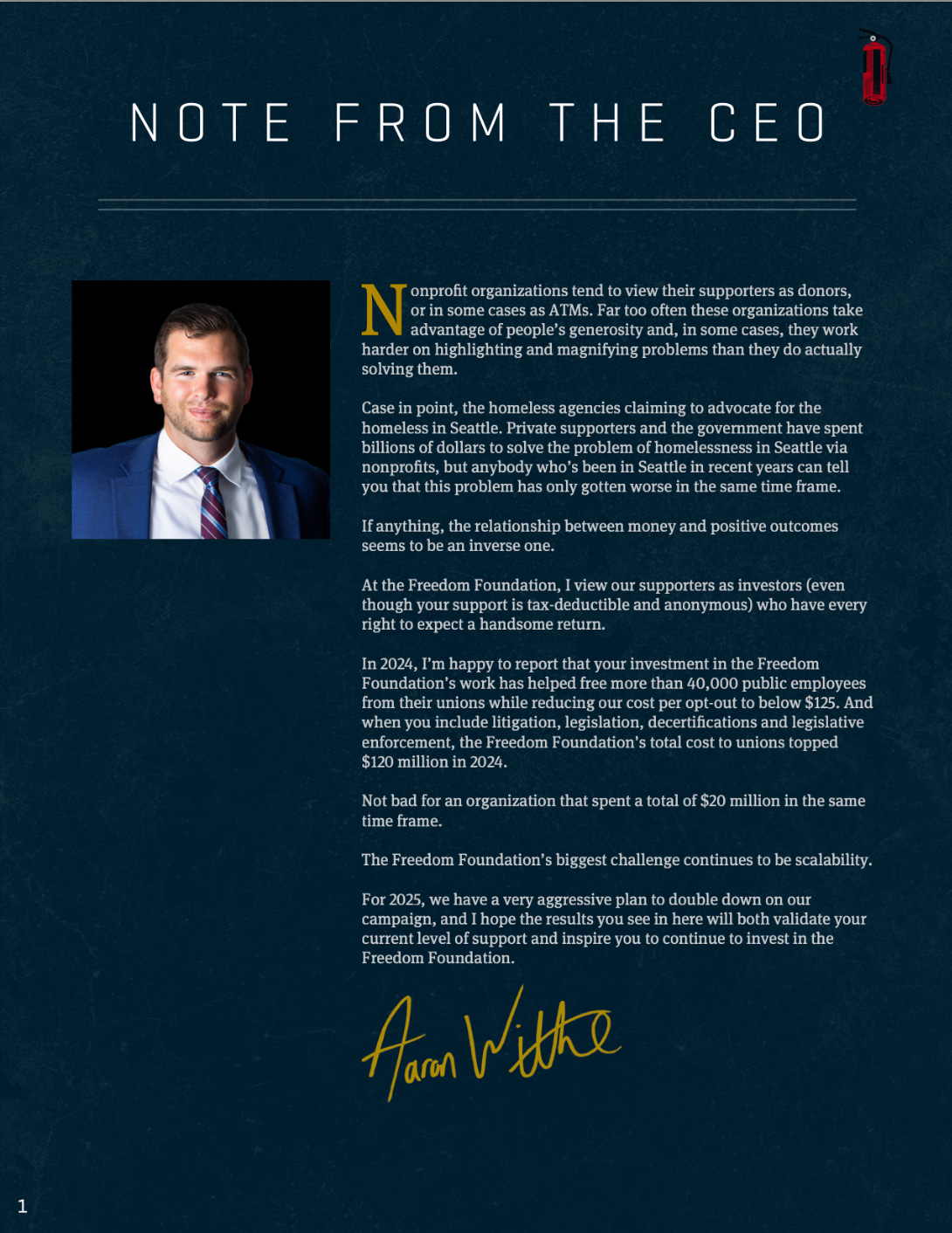 A confidential donor memo obtained by Source Code details a "very aggressive plan" by the Freedom Foundation to advance its anti-union agenda in collaboration with the Trump administration and Elon Musk's Department of Government Efficiency (DOGE). The group's strategy for 2025, outlined in the memo, includes promoting a raft of state and federal legislative actions, launching a pro-capitalist, anti-union teacher group, and targeting conservative school boards to undermine unions, even in traditionally blue states. The group claims it drove 40,000 public sector workers from their unions in 2024, costing them over $38 million. Freedom Foundation CEO Aaron Withe told donors, "I view our supporters as investors" entitled to "a handsome return on their investment."
